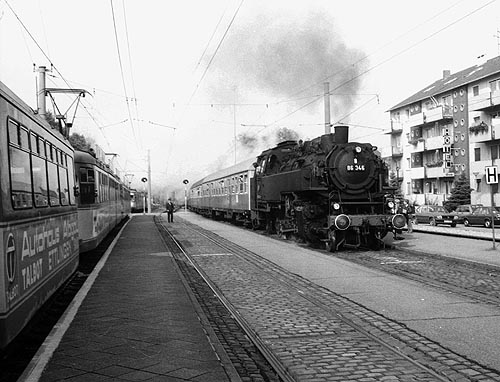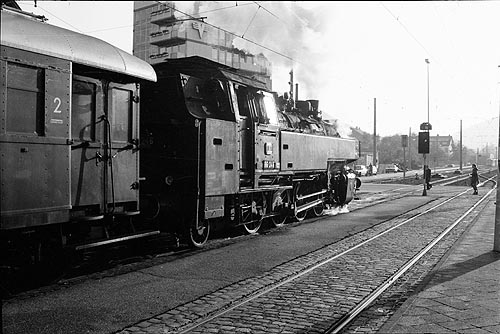 Geblieben ist das Gleis 2 für den Dampfzug, der hier gerade abfährt (1979, DS) |
