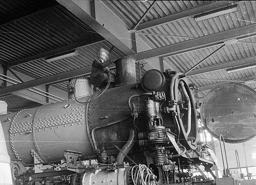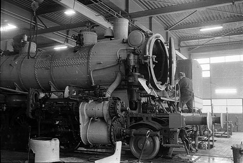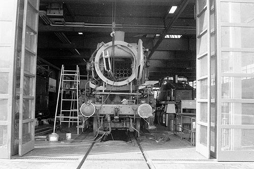 Vollkommen ausgeachst steht die Lok in der Mehrzweckhalle. Die Radsätze treffen aber gerade ein. Links der längst nicht mehr vorhandene Turmtriebwagen der AVG. (FE)