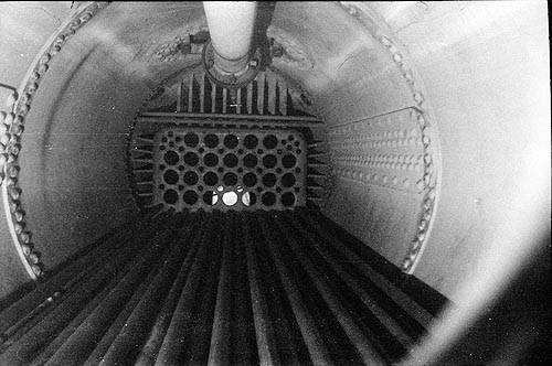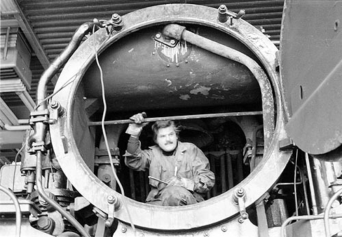 Im Winter 1980/1981 wurde die erste HU in eigener Regie in der Mehrzweckhalle der AVG in Ettlingen durchgeführt. Hier die leergeräumte Rauchkammer.