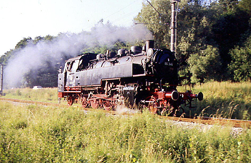 Mit viel Getöse wurden verschiedene Schotterzüge für die AVG gefahren. Die 86er brachte viel mehr Leistung als die damals vorhandenen Dieselloks, die jeweils höchstens zwei der vierachsigen Schotterwagen befördern konnten. Hier konnte die Maschine nach der HU so richtig zeigen, dass sie noch lange nicht zum alten Eisen gehört. (DS) |