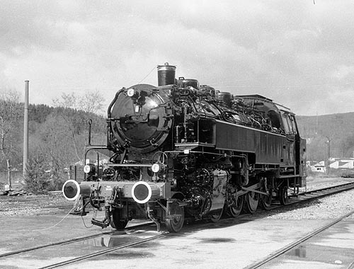 Erstes Anheizen nach der Hauptuntersuchung 1980/1981 (DS). Die Lok glänzt im frischen Lack wie neu. Nummernschilder wurden seinerzeit nur für den Betrieb angebracht. Am Kamin leuchtet neuerdings ein Messingring. Für den besseren Saugzug ist ein Ventilator in den Kamin gestellt, der gerade noch zu erkennen ist. (DS) |