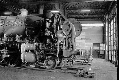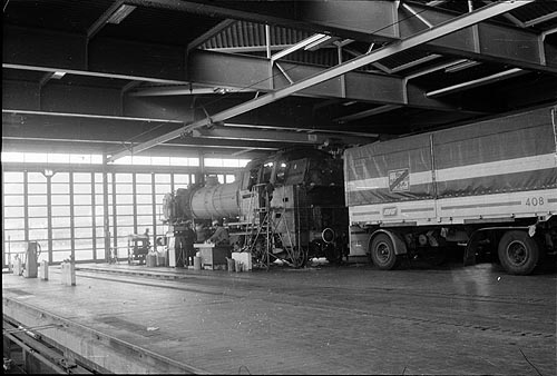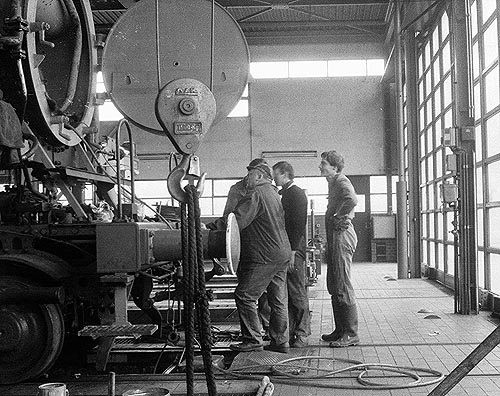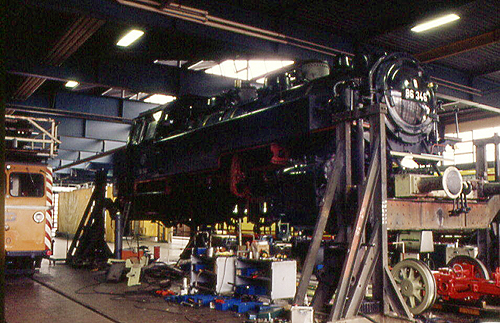 Vollkommen ausgeachst steht die Lok in der Mehrzweckhalle. Die Radsätze treffen aber gerade ein. Links der längst nicht mehr vorhandene Turmtriebwagen der AVG. (FE)