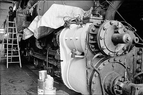 Das Triebwerk wurde mit Planen vor herabfallendem Dreck geschützt.